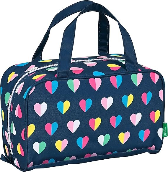 El neceser rectangular Benetton Love Corazones destaca por su diseño divertido y lleno de color, con un estampado de corazones multicolor sobre fondo azul marino y el icónico logo de la marca.