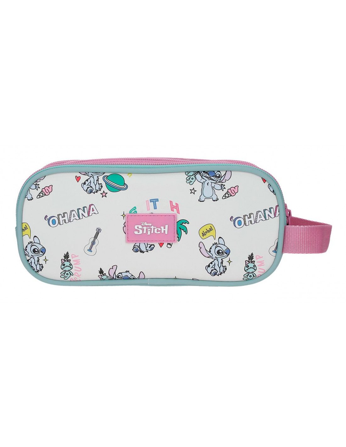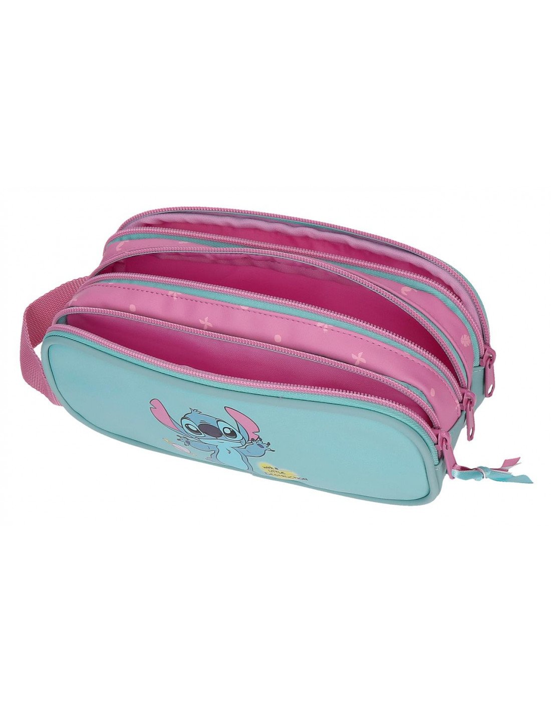 El neceser triple Stitch “Little Destruction” es la opción perfecta para quienes necesitan máxima organización en un solo accesorio. Inspirado en el divertido universo de Lilo & Stitch, destaca por su diseño alegre en tonos rosa y turquesa con ilustraciones de Stitch y detalles “Ohana”.