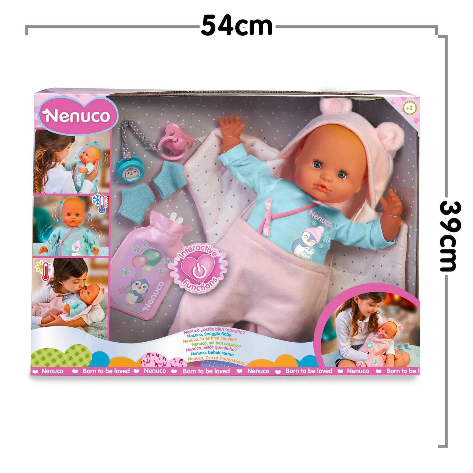 ¿Nenuco tiene frío o calor? Controla la temperatura de Nenuco. Si Nenuco tiene frío empezará a temblar ¡oh no! Tenemos que hacer que entre en calor. Mete a Nenuco en su saquito, ponle los patucos y la bolsita de agua caliente. ¡Listo! Pero, ¡oh no! Ahora la frente de Nenuco se ha puesto rojita, tiene mucho calor. Debemos regular de nuevo su temperatura quitándole la ropita. ¡Juega una y otra vez a abrigarle hasta que se le ponga rojita la frente, y a quitársela hasta que empiece a temblar! Edad recomendada: + 3 años. No recomendable para menores de 3 años, ya que contiene piezas pequeñas que podrían provocar asfixia en caso de ser ingeridas por el niño/a.