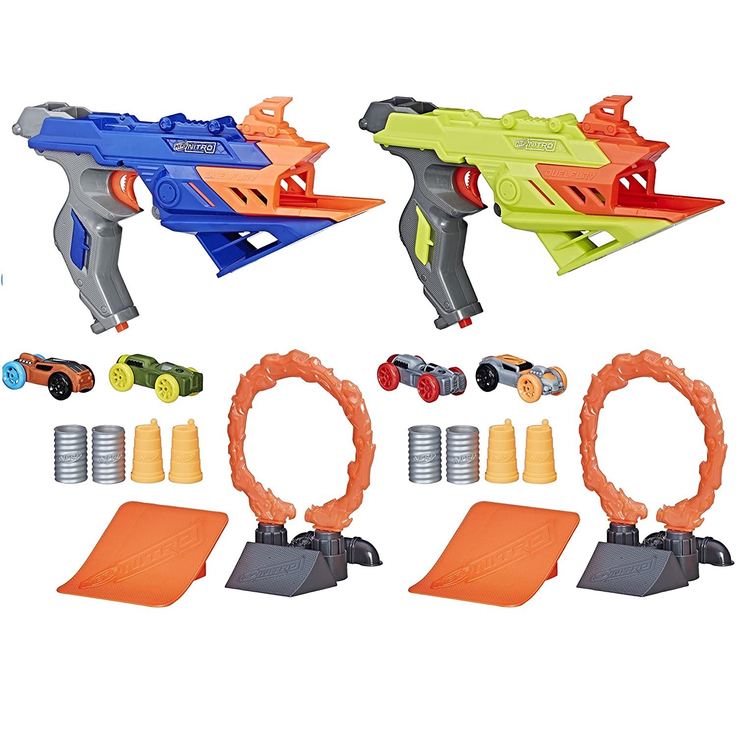 El Nerf Nitro DuelFury Demolition incluye dos anillos de fuego que desafían a los niños a apuntar y lanzar con precisión para saltar entre los anillos.