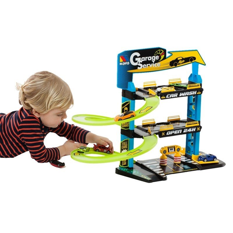 Resistente y compacto parking de 3 plantas con zona de aparcamiento, ascensor, gasolinera y elevador de coches. Medidas aproximadas del parking montado: 40 x 56 x 35 cm.