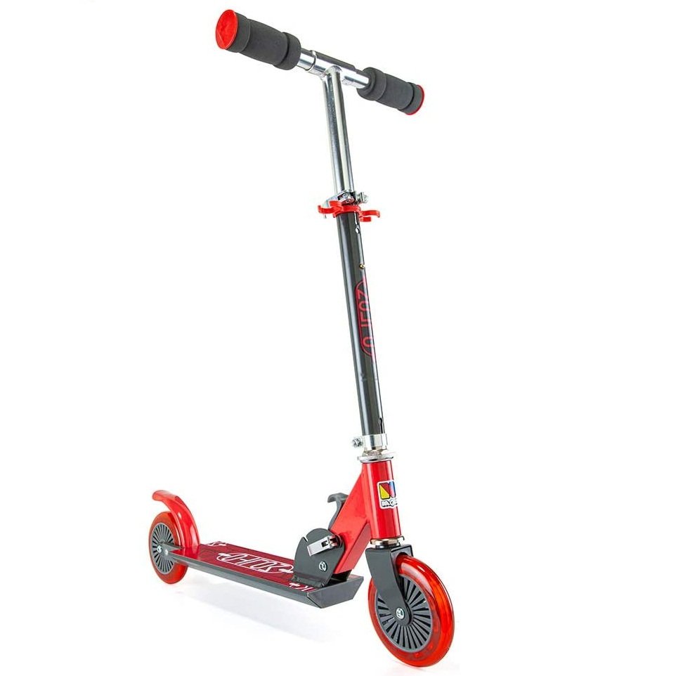 Patinete unisex, fabricado en aluminio, plegable y con cierre de seguridad. Con plataforma antideslizante, ruedas de poliuretano de 120 mm, sistema ABEC 5, peso máximo del usuario: 50 kgs y manillar regulable en altura con dos posiciones 72 – 77 cms suave y acolchado con un gran agarre que garantiza comodidad y control. Sistema de frenado por fricción trasera y un pie de apoyo. A partir de 3 años.