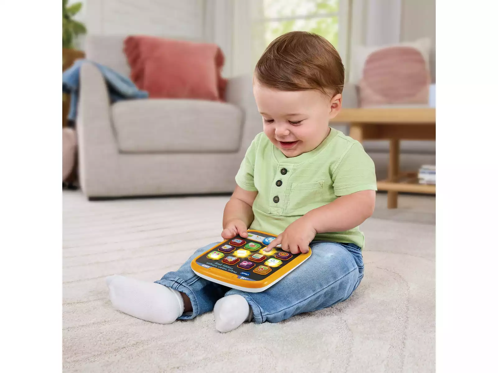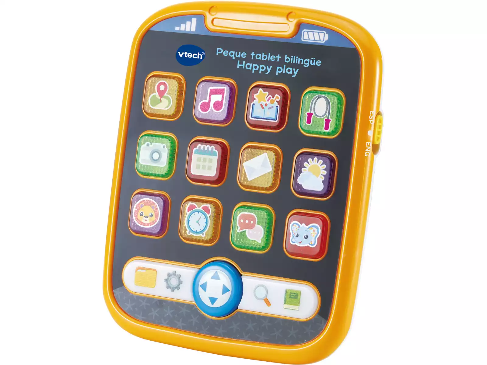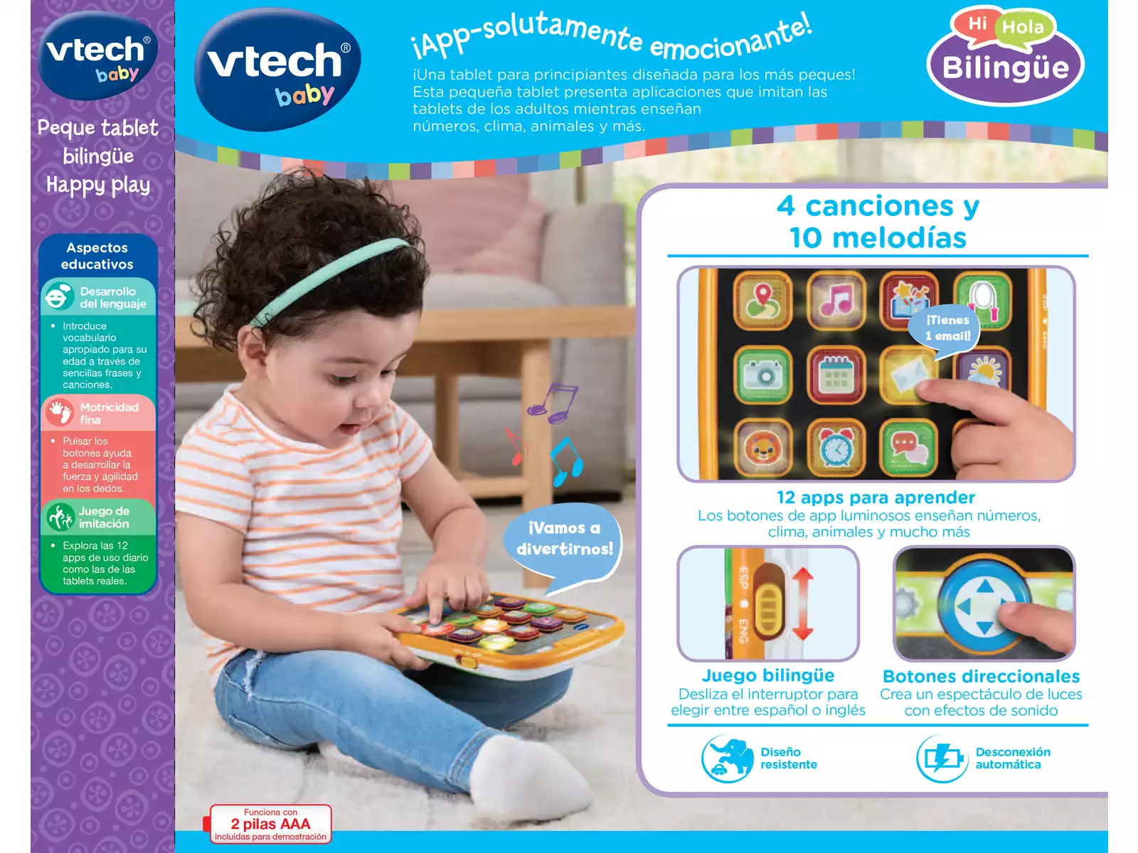 La Peque Tablet Bilingüe Happy Play de VTech es una divertida herramienta para introducir a los niños en el aprendizaje temprano del inglés y el español. Con botones interactivos, luces y sonidos, esta tablet enseña letras, palabras, números y frases básicas.