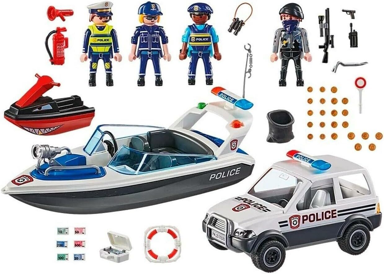Incluye 🚓 coche patrulla, 🚤 lancha de policía y 🏍️ moto acuática para los ladrones.
