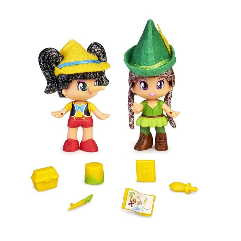 Pack de 2 figuras de cuentos para coleccionar; Pinocho y Peter Pan. Cada figura de Pinypon mide unos 7 cm aproximadamente. Este set incluye además, dos sombreros de tela, pelos intercambiables y pequeños accesorios. Las figuritas de Pinypon estimulan la diversión y la creatividad. +4A.