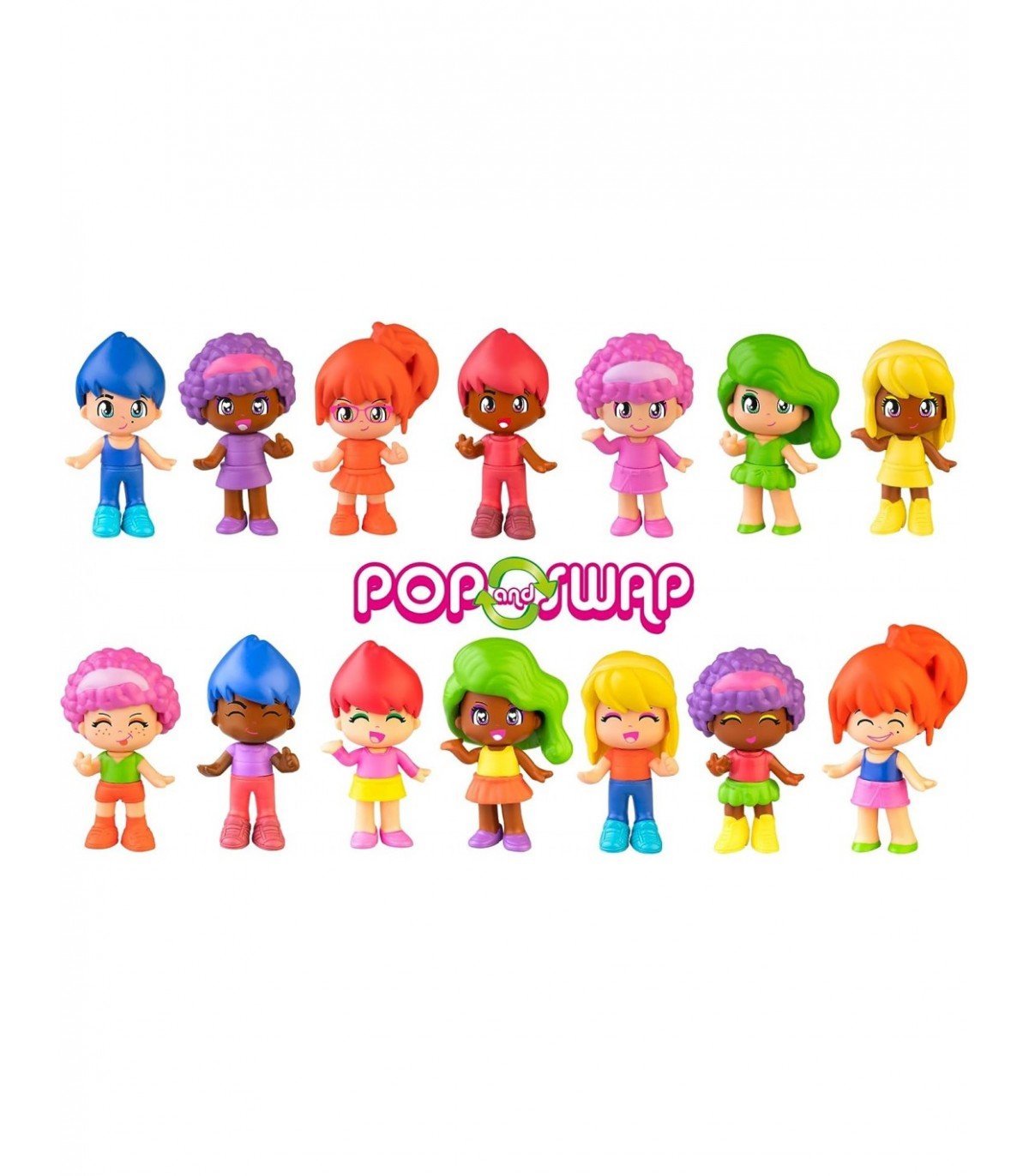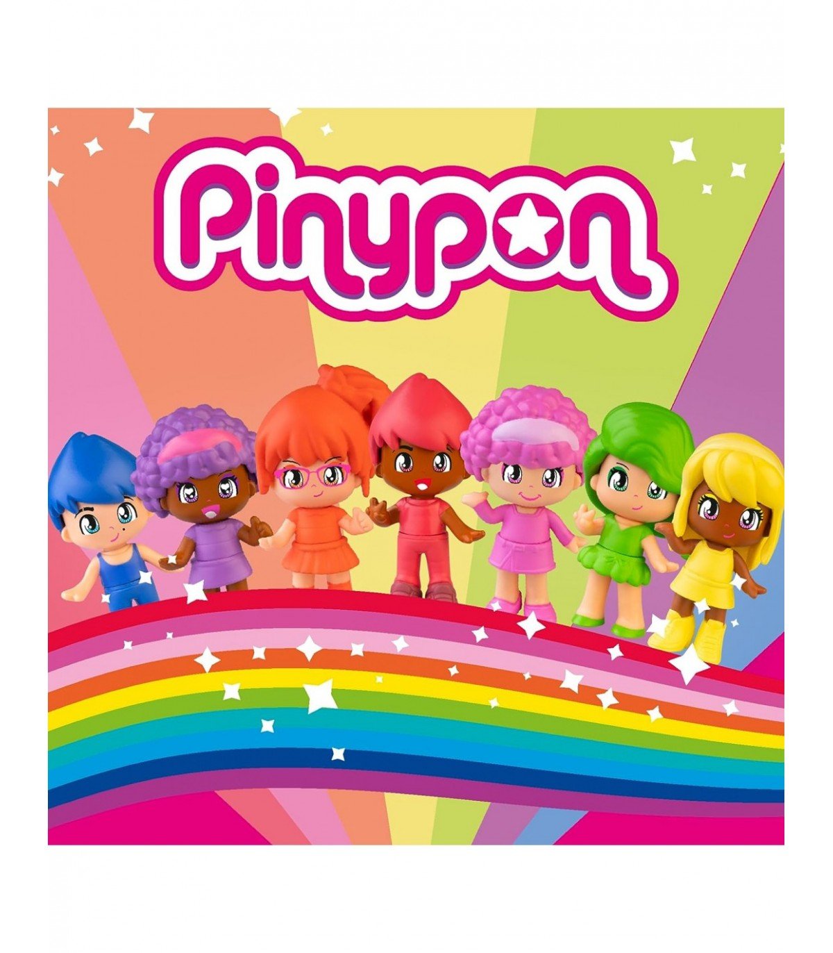 Pinypon Tubo Arcoiris Ref: PNY43000.Siete figuras de Pinypon decoradas con los 7 colores del arcoíris: rojo, rosa, naranja, amarillo, verde, morado y azul. Con doble cara para crear infinitas combinaciones de diversión. Intercambiables entre ellas y con el resto de figuras.