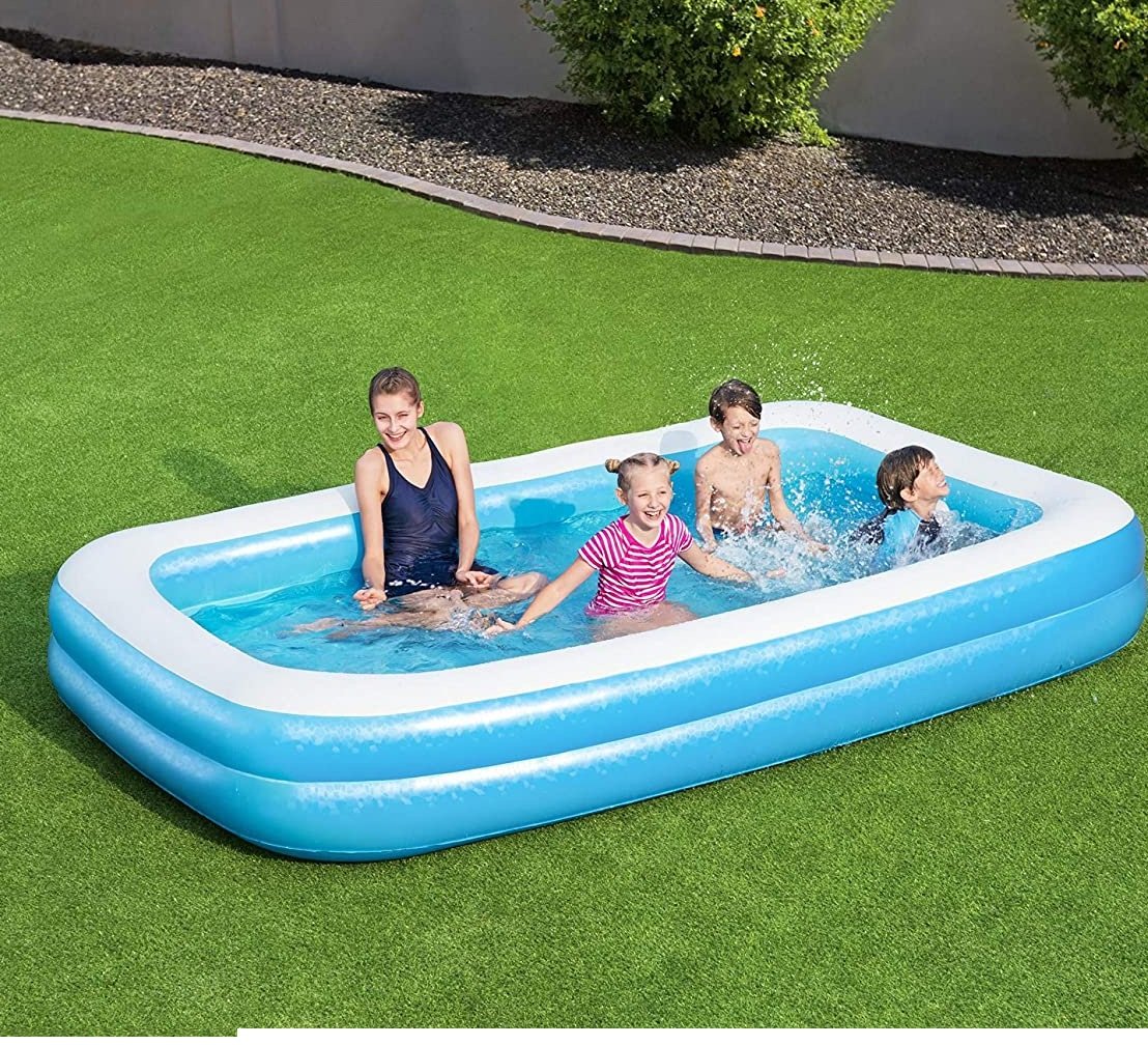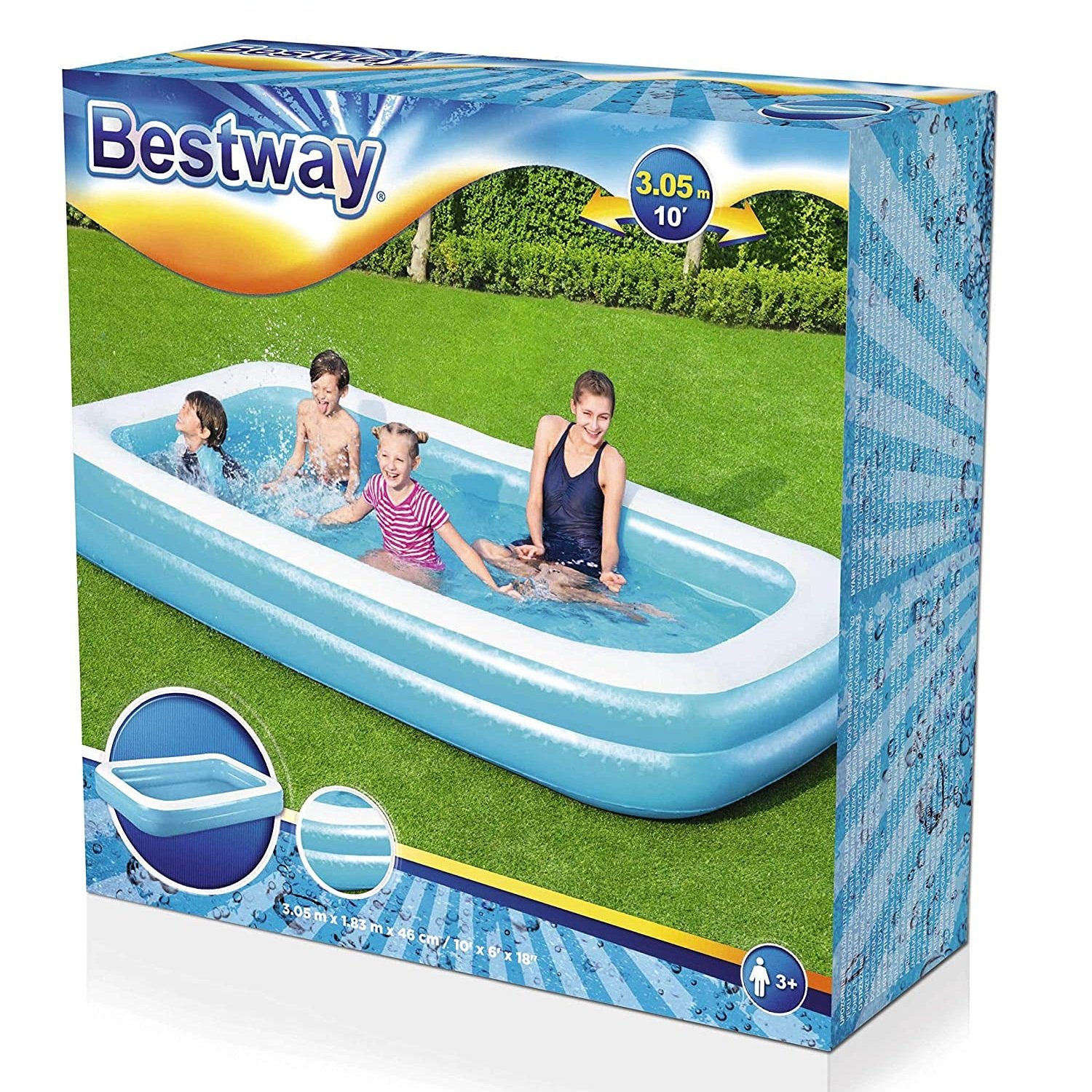 ¡Que tengas un buen baño en el jardín! Esta espaciosa piscina familiar Bestway garantiza horas de diversión en el agua. Puede contener 850 l de agua, tiene más de 3 m de largo, 1,83 m de ancho y 46 m. En los días calurosos se puede remar en esta piscina hinchable. Esta piscina familiar consiste en 2 anillos extra anchos y está así bombeada. ¿Y has terminado de salpicar otra vez? Luego dejas que el agua se escurra a través de la válvula de drenaje de fácil uso.