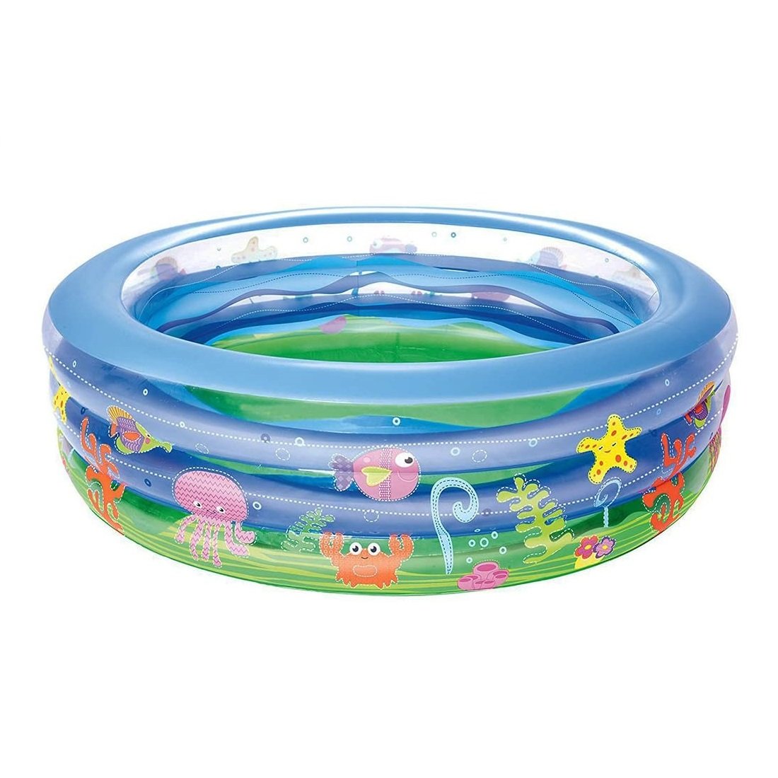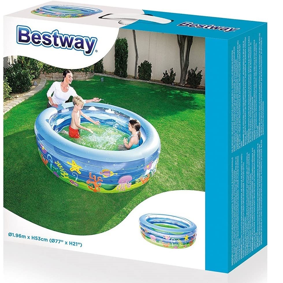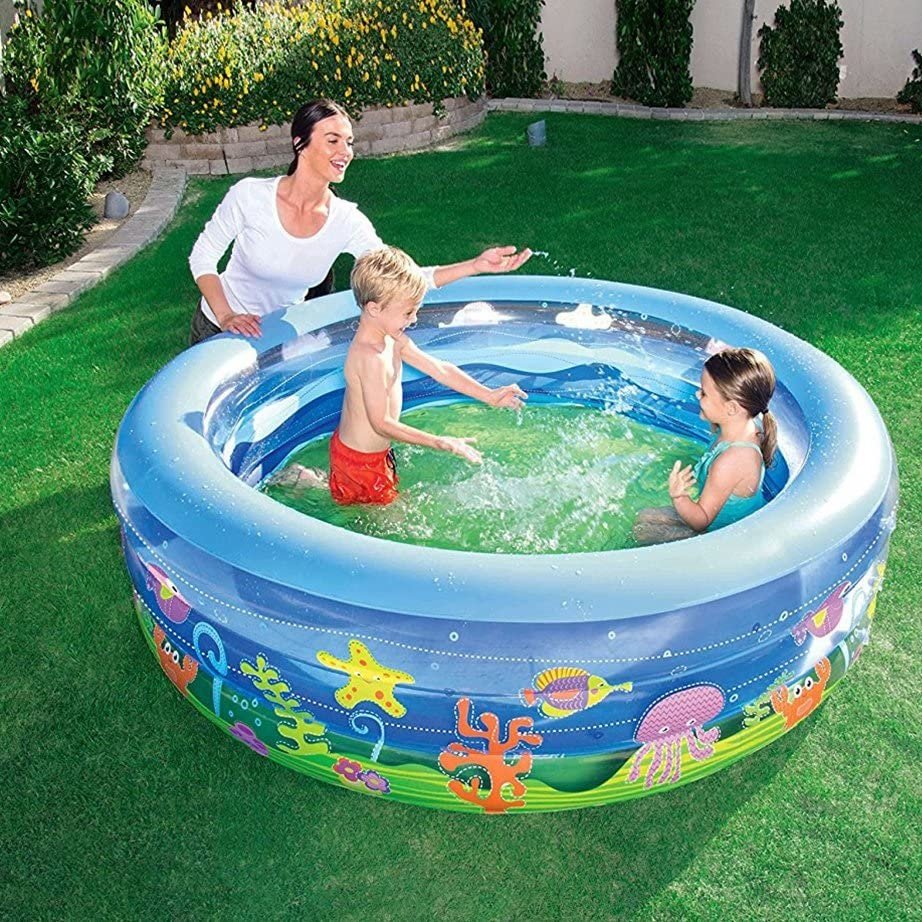 Es una buena idea esta piscina hinchable con paredes extra gruesas, fabricada en vinilo resistente, que cuenta contres válvulas de seguridad, para entretener a los niños.