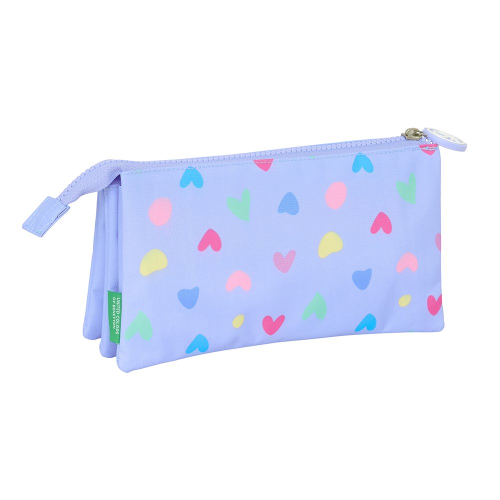 El estuche triple Benetton Love es la opción perfecta para mantener todo el material escolar organizado con estilo. Su diseño en color lila con corazones multicolor y el icónico logo Benetton lo convierten en un accesorio moderno y divertido.