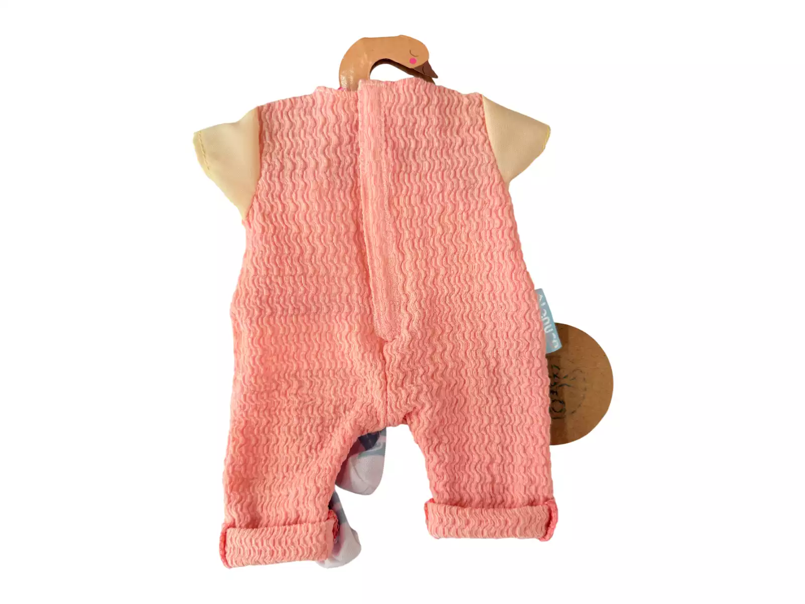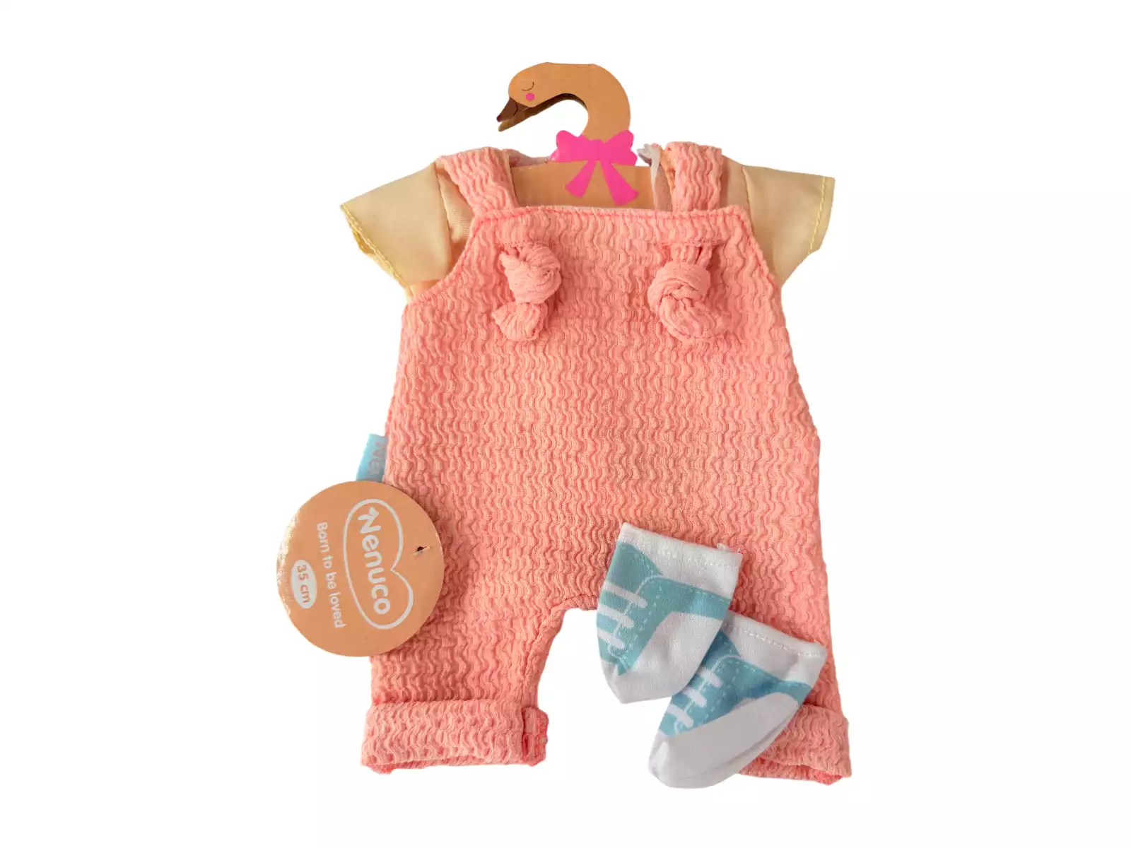 Peto de color rosa con camiseta de manga corta en color beige y dos tirantes, unos patucos de color blanco y azul y una percha de color marrón con forma de cisne con lacito de color rosa.