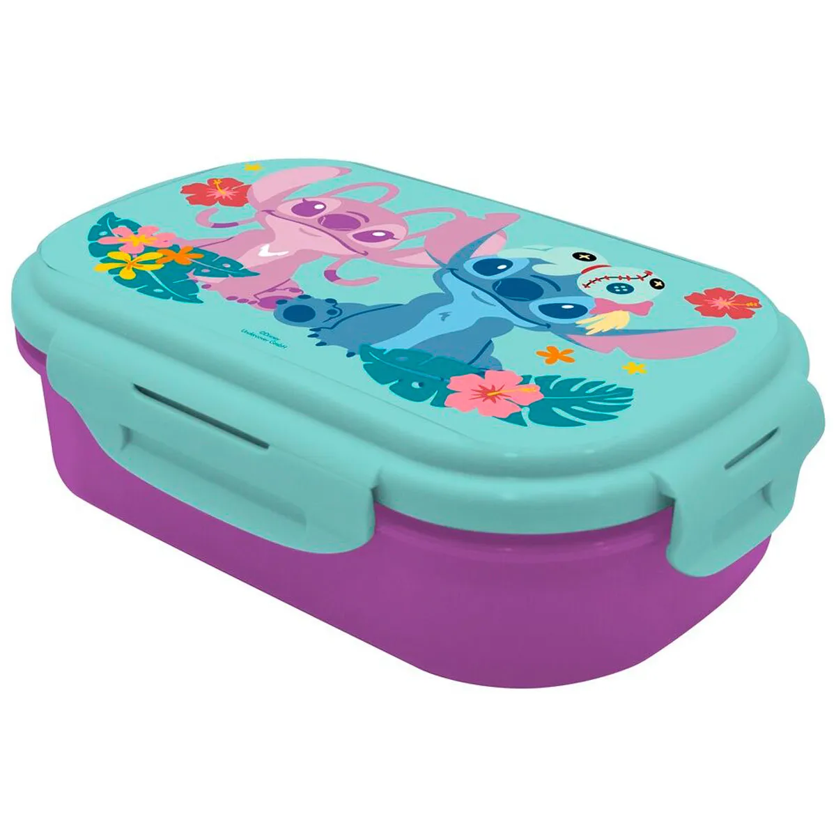 Sandwichera Rectangular Disney de Stitch πŸΎπŸ’™ con tapa decorada con Stitch y Angel πŸ’œ, rodeados de flores tropicales 🌺🌴.