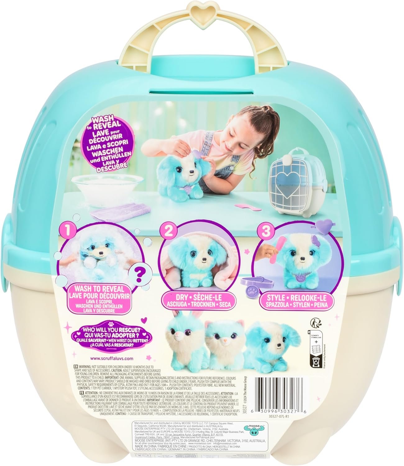 Con Scruff a Luvs Aqua, los niños podrán rescatar a una mascota misteriosa que necesita amor y cuidados. Al lavarla, secarla y peinarla, descubrirás si es un perrito, gatito o conejito 🐕🐈🐇.