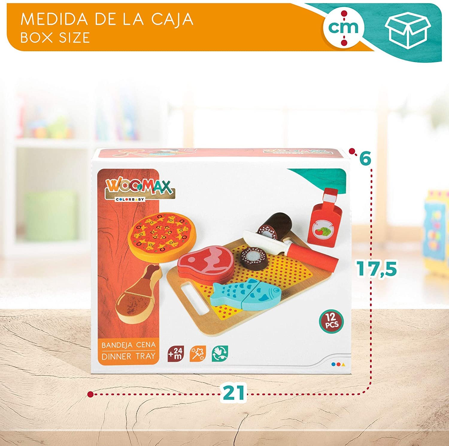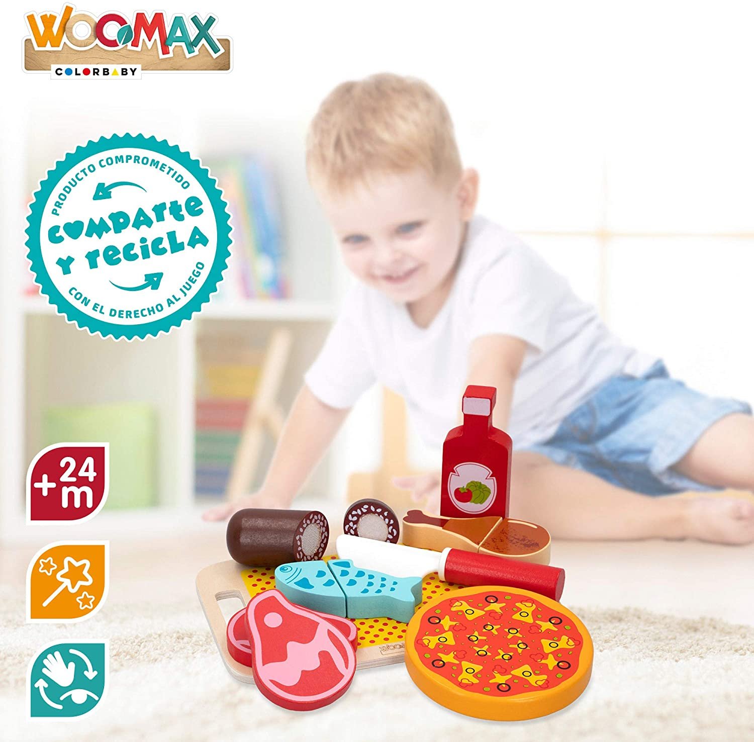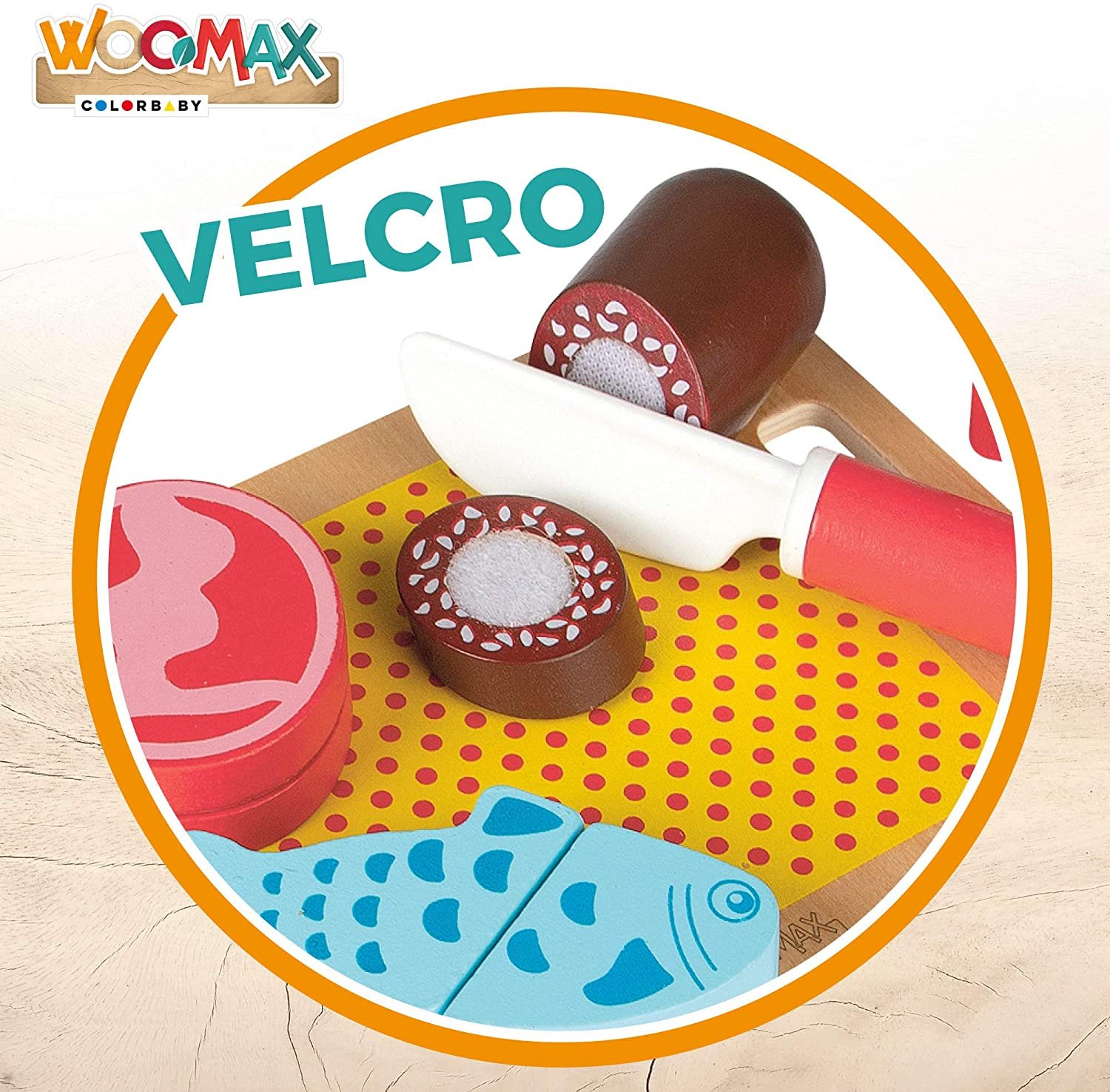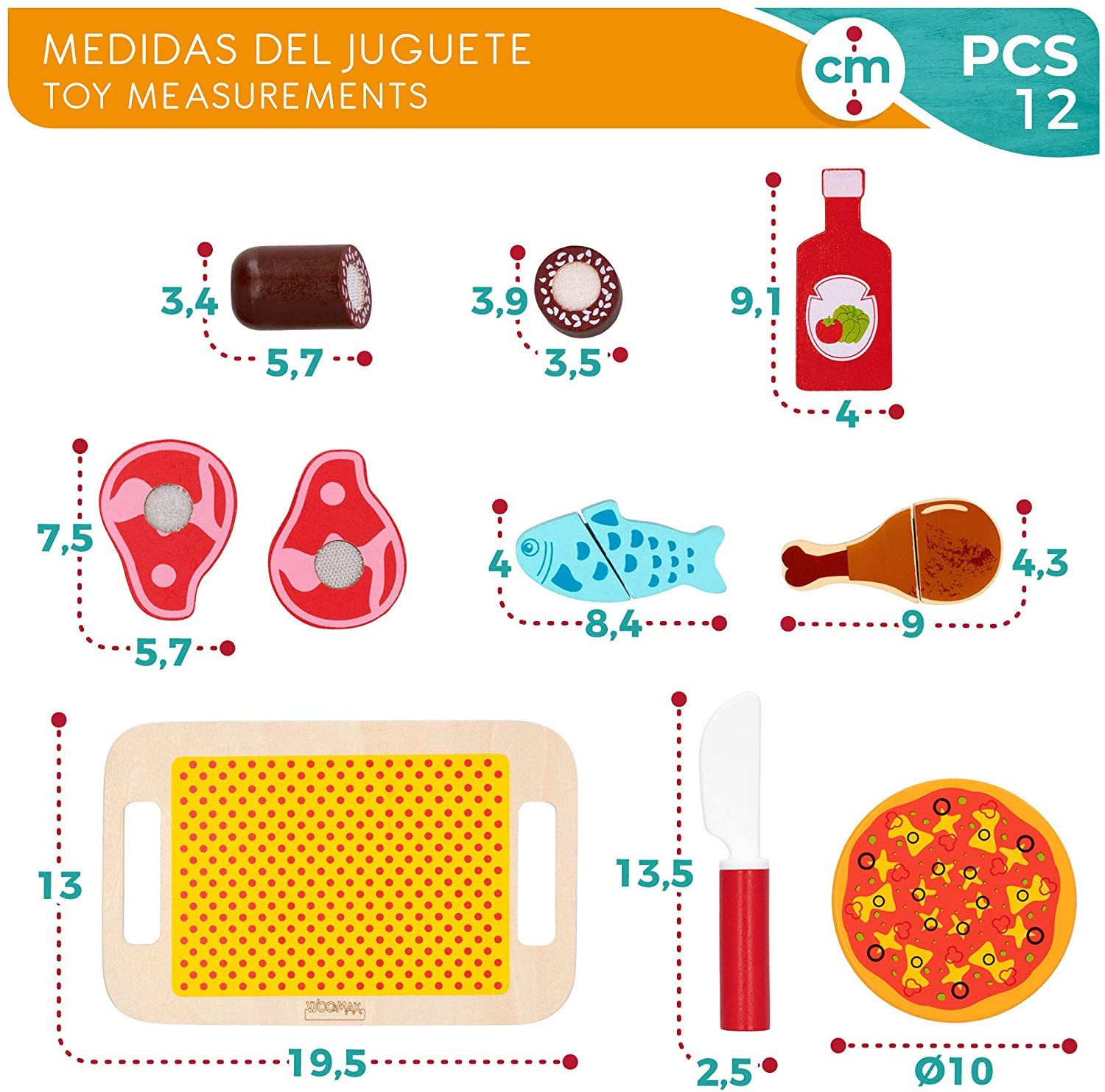 12 piezas: Cada pieza tienen velcro para combinar, unir y separar las piezas (pizza, filete, pescado, muslito, embutido, salsa, tabla y cuchillo)