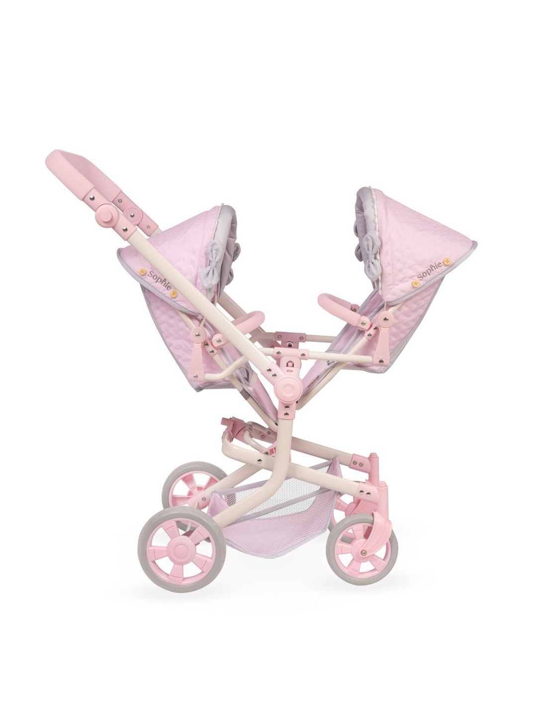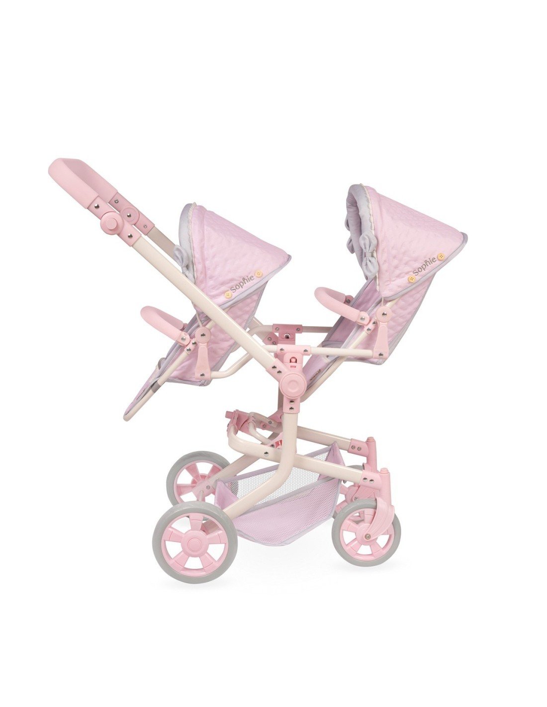 Incluye: 1 silla gemelar de paseo de la linea Sophie de color rosa con detalles grises, estructura plegable multiposiciones, tela acolchada, manillar con altura ajustable, lazos acolchados, detalles bordados, botones decorativos en madera natural, ruedas delanteras giratorias, bolso a juego con asas de madera natural, ruedas con cubierta de foam, bandeja portaobjetos de tela, cinturones de seguridad y muchos más detalles de lujo.