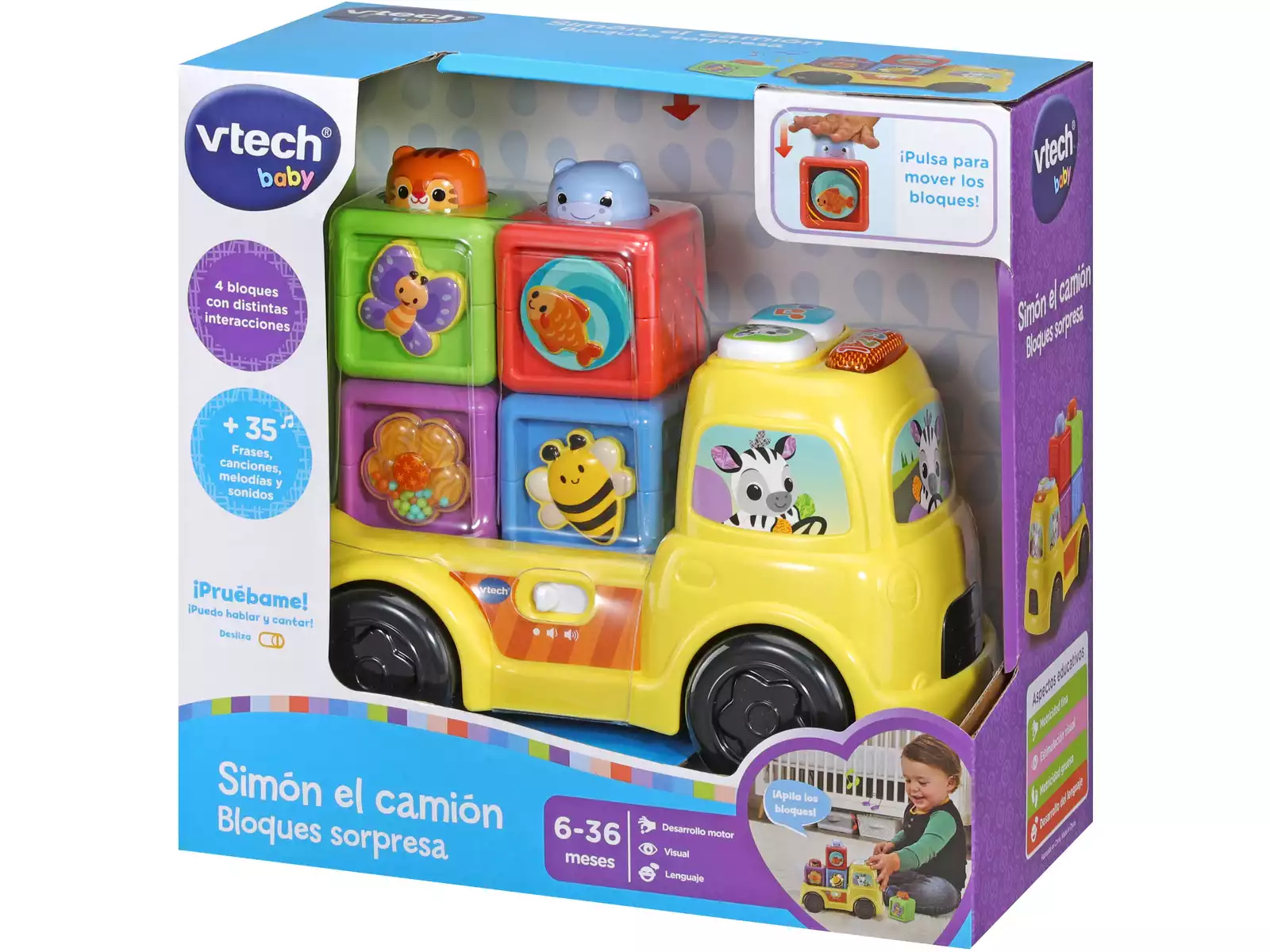 Simón el Camión de VTech Baby con 4 bloques interactivos, más de 35 sonidos y funciones educativas. Ideal para bebés de 6 a 36 meses. Juguete didáctico, seguro y perfecto para regalar. Funciona con pilas.