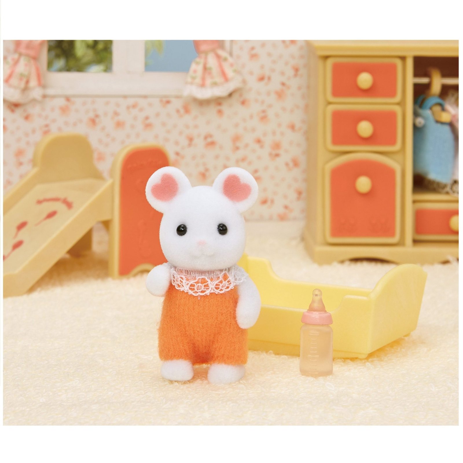 Conjunto de Bebé Ratón Marshmallow con su cuna, biberón y su ropa característica.