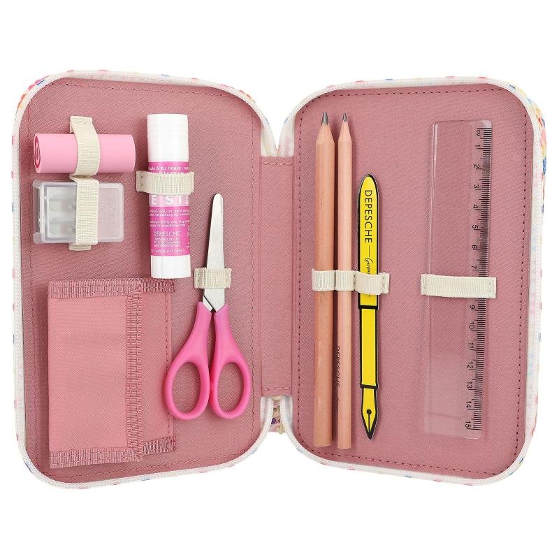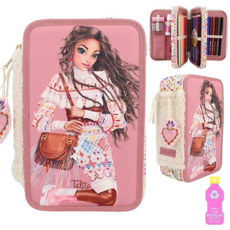 Chulísimo y gustosito: El estuche de TOPModel color rosa viejo destaca por la imagen de una modelo a gran tamaño en la cara delantera, el lateral de pelo sintético color crema y las cremalleras con estampados de varios colores. Los tres compartimentos separados vienen llenos con: 18 rotuladores, 18 lápices de colores, 2 lápices, sacapuntas, goma de borrar, tijeras, pegamento en barra e incluso cuenta con un bolsillito con cierre de velcro. Como extra monísimo lleva un colgante de corazón de alegres colores. Material principal: poliéster reciclado 100 por 100; resto: poliéster 100 por 100.