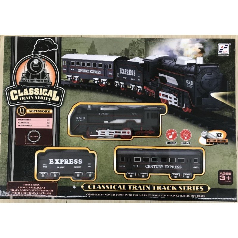 Divertido tren clásico con locomotora , y dos vagones. Tiene luces y sonidos como a los trenes de verdad. El circuite mide 79cm por 79cm. Son ncesarias 2 pilas AA-6 no incluidas.