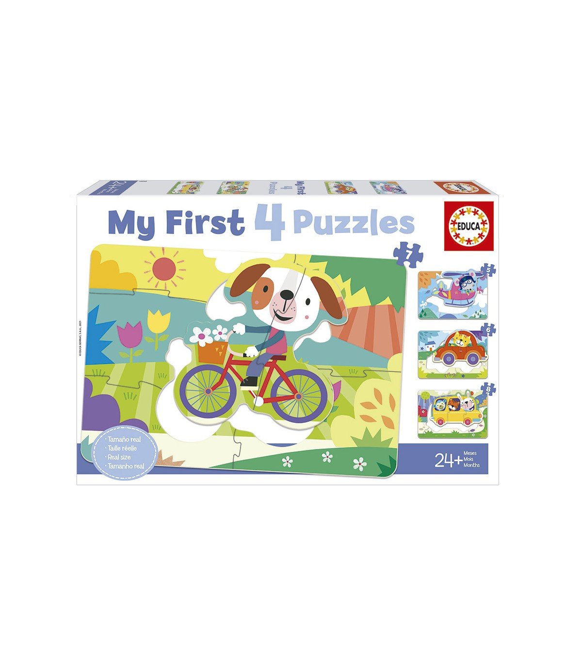 Juego de 4 puzzles progresivos de 5 a 8 piezas y de dimensiones 23,5 x 16 cm. Cada rompecabezas contiene 1 o 2 elementos/personajes extraíbles hechos de 1, 2 o 3 piezas. Escenas coloridas y atractivas, adecuadas para edades tempranas y con piezas grandes fáciles de manejar y montar. Espaldas de los puzzles personalizadas, para que el niño pueda identificar fácilmente a qué puzzle pertenece cada pieza. Temática: Vehículos