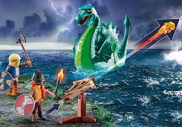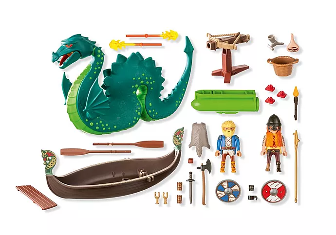 ¡Aventura en alta mar con este set Playmobil de 40 piezas! Incluye un barco vikingo, dos guerreros, un dragón marino articulado y accesorios como escudos, armas y antorchas. El dragón puede flotar en el agua 🌊 y escupir proyectiles de fuego 🔥, mientras los vikingos se defienden con su ballesta lanzadora.