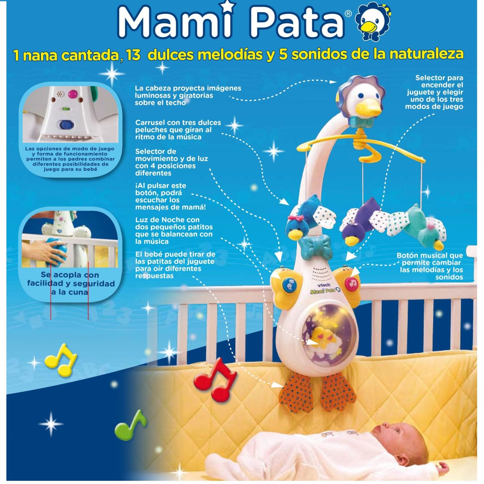 • Sensor de voz que se activa al oír el llanto del bebé, poniendo en funcionamiento el juguete.